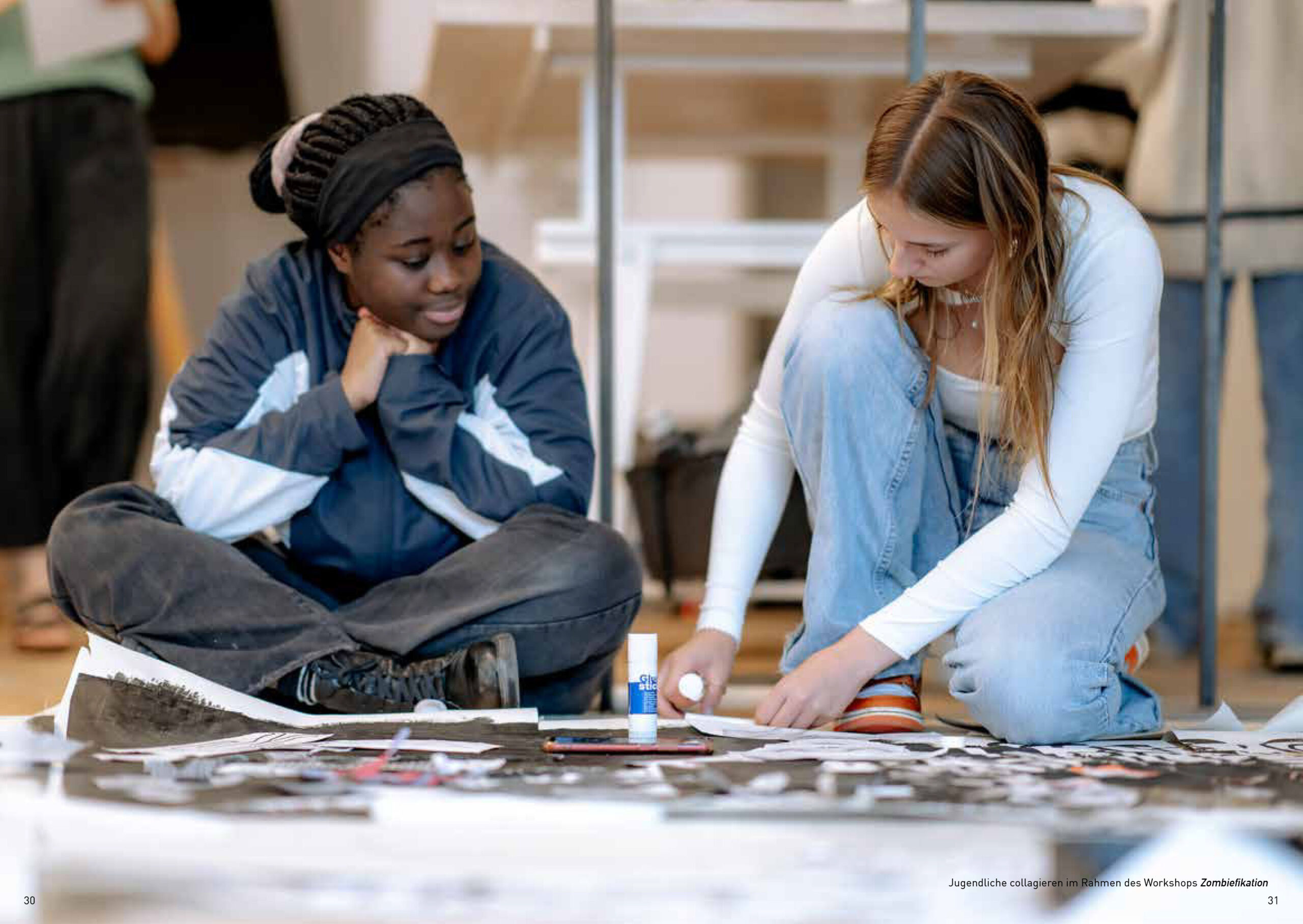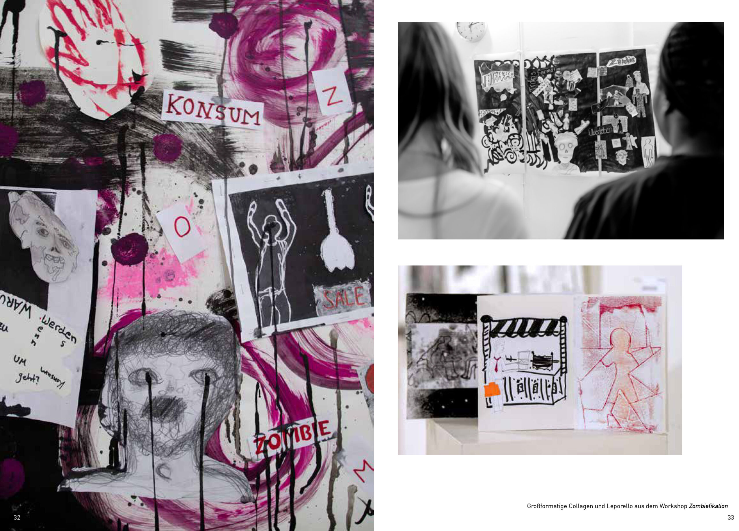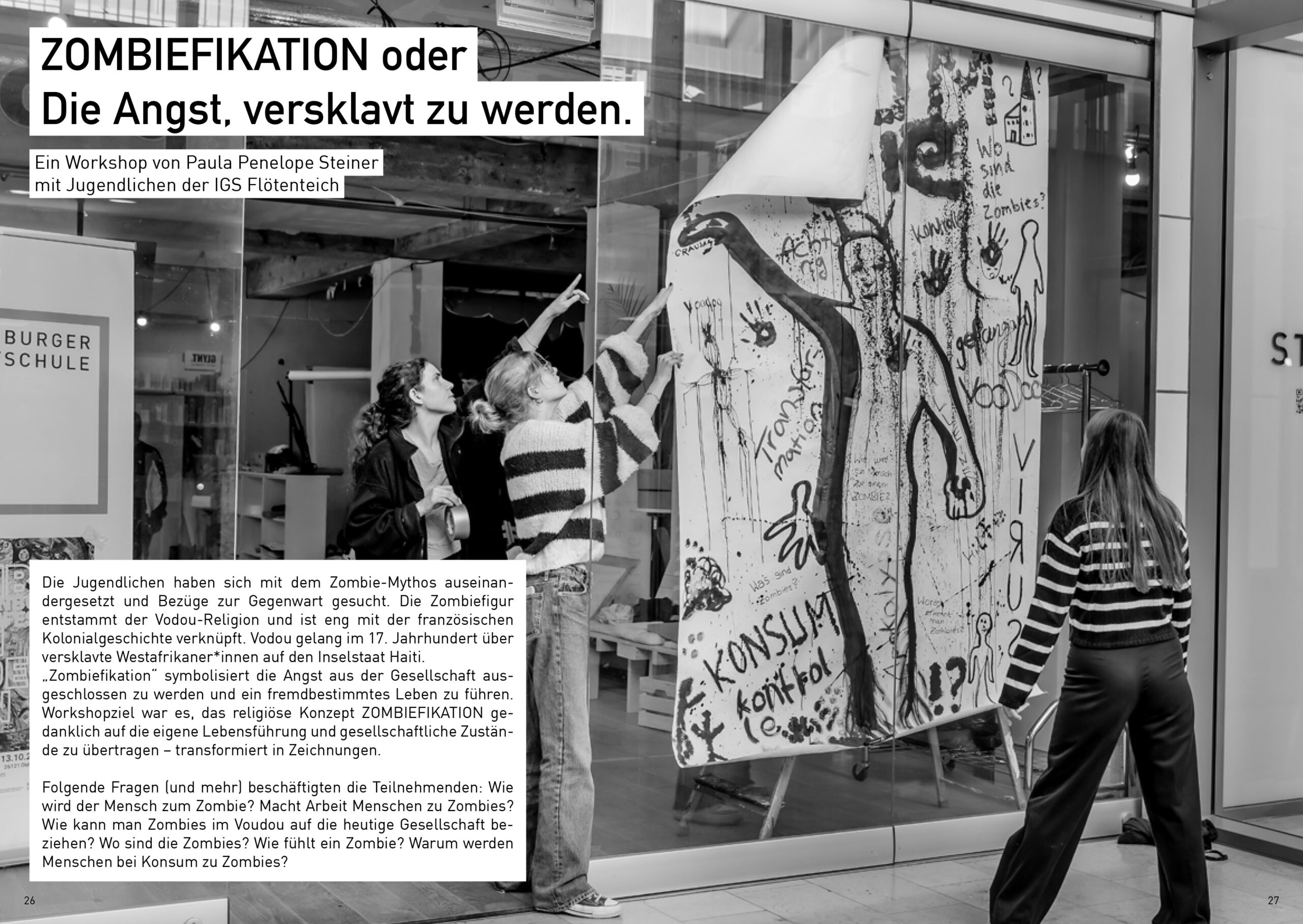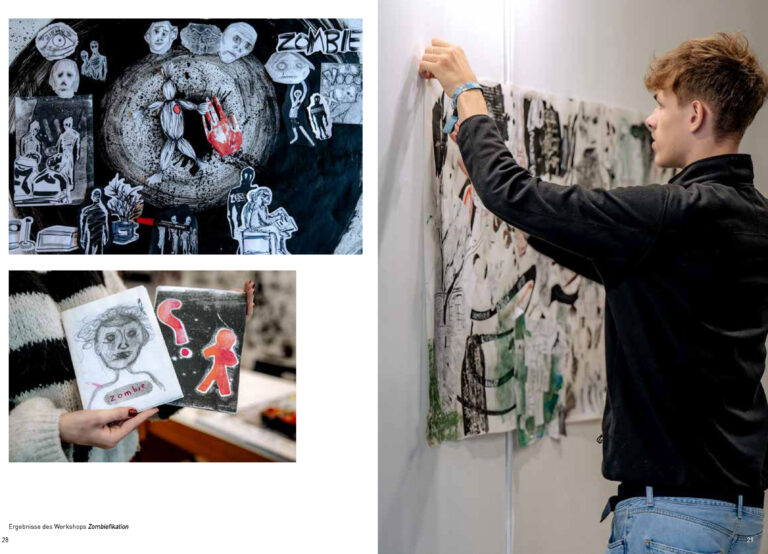 Ziel des Workshops war es, das religiöse Konzept der Zombiefikation gedanklich auf das eigene Leben und auf gesellschaftliche Zustände zu übertragen – transformiert in Zeichnungen. Dabei beschäftigten uns unter anderem folgende Fragen: Was ist ein Zombie? Wie wahrscheinlich ist es, dass die uns umgebenden Dinge – Kleidung, Essen, Möbel – von Zombies im übertragenen Sinn hergestellt wurden, also von Arbeitskräften, die unter unwürdigen Bedingungen für wenig Lohn arbeiten? Und: Gibt es Lebensbereiche, in denen wir uns unterwerfen und fremdbestimmt fühlen?